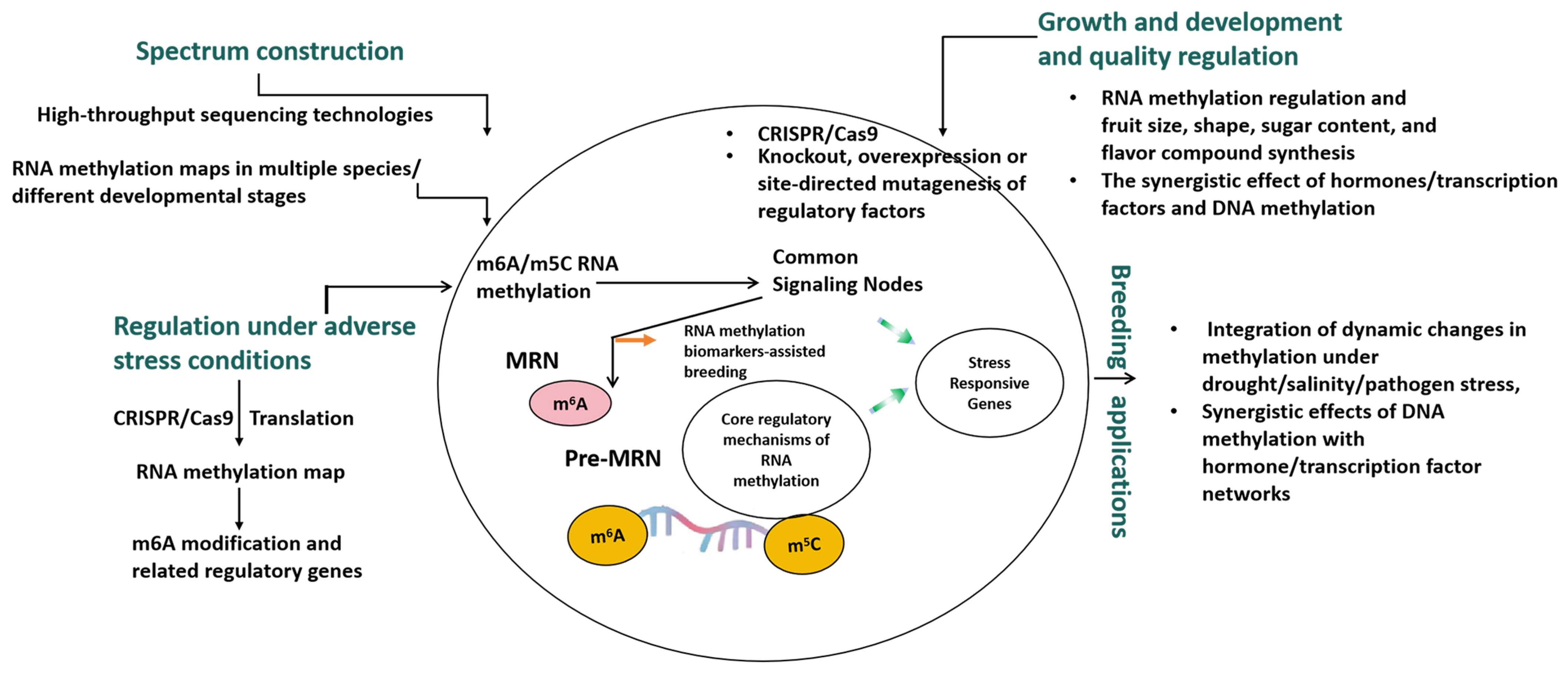 The second is the functional validation and genetic manipulation of RNA methylation regulation mechanisms. There is an urgent need to develop efficient genetic transformation and regeneration systems for different Cucurbiaceae species to facilitate the wide application of gene editing tools such as CRISPR/Cas9 for precise knockout, overexpression, or site-directed mutagenesis of specific RNA methylase (writer), demethylase (eraser), and binding protein (reader) genes—to systematically explore the specific functions of these regulatory factors in the growth and development, fruit quality formation, and stress resistance of cucurbitaceae plants.