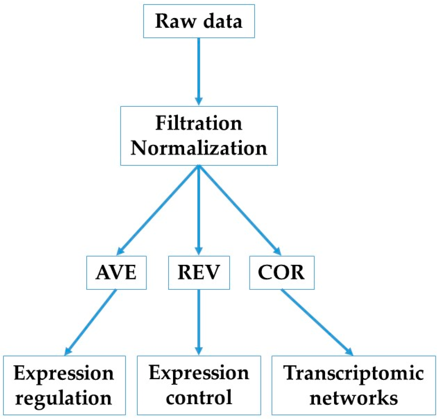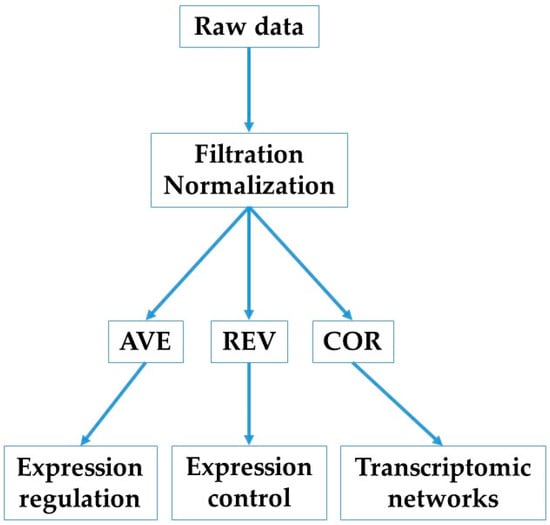 Background-subtracted foreground fluorescence signals were averaged for spots redundantly probing the same gene. According to our standard procedure [] (flowchart in Figure 1), each properly quantified gene was characterized in each condition by three independent characteristics: AVE, REV, and COR.