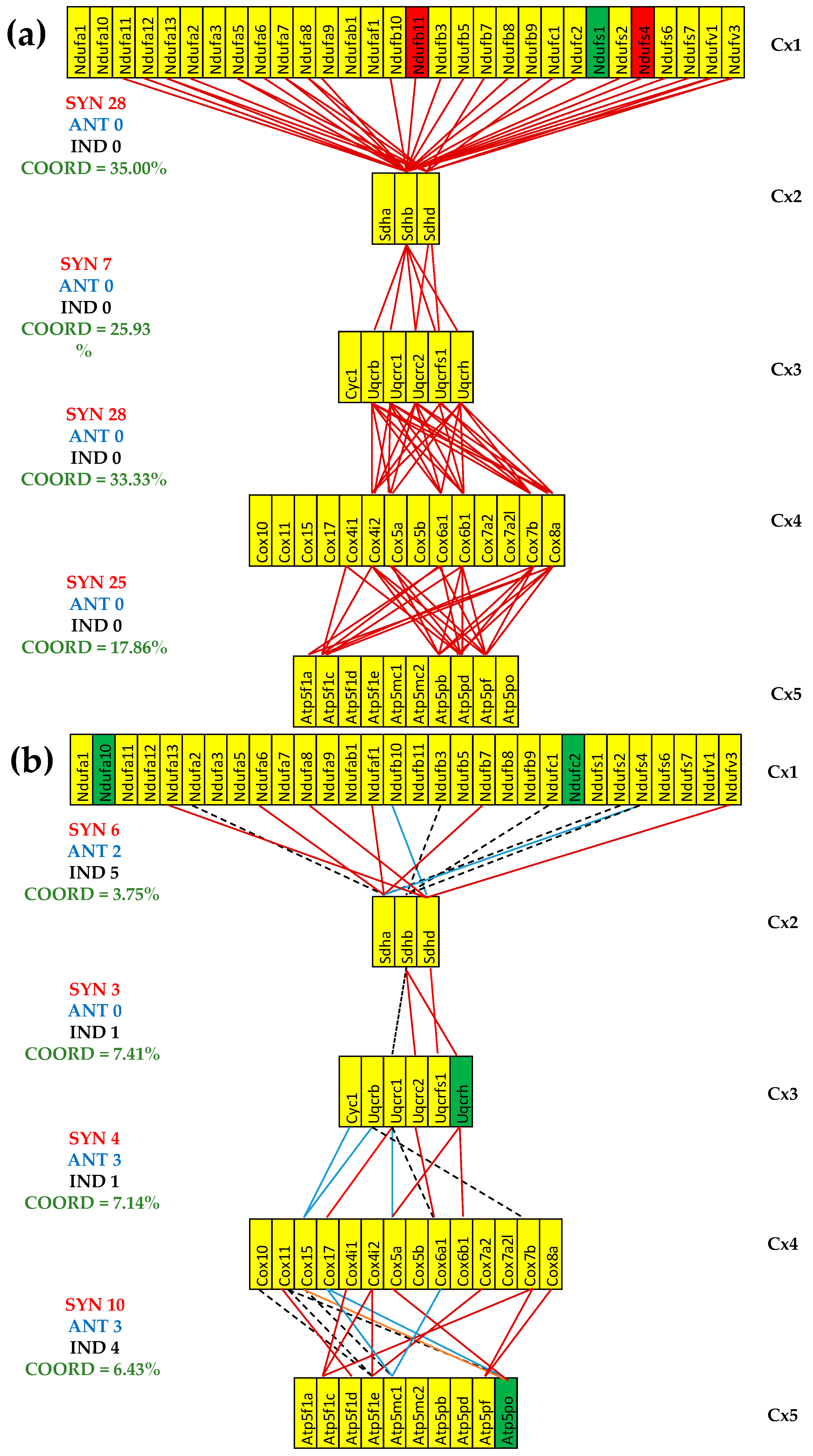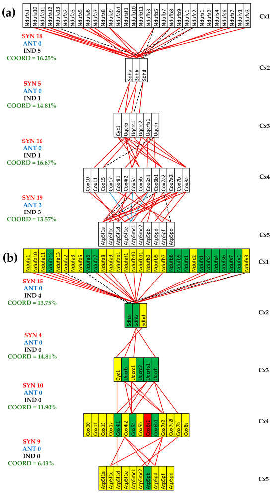 Figure 5 presents the (p < 0.05) significant transcriptomic networks coupling the five complexes of the oxidative phosphorylation in the left heart ventricles of healthy and untreated CCC and IHF mice. One observes that the adjacent complexes are coupled in all conditions mostly by synergistic expression correlations and that the coordination degree (computed with Formula (2)) is significantly lower in the untreated cardiomyopathies, indicating a partial decoupling of the complexes. The coordinated percentages were computed for the 80 possible gene pairs between Cx1 and Cx2, 27 between Cx2 and Cx3, 84 between Cx3 and Cx4, and 140 between Cx4 and Cx5.