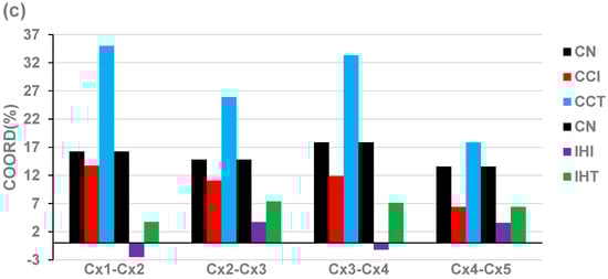 COR analysis was used to identify the (p < 0.05) significant transcriptomic networks based on the “principle of transcriptomic stoichiometry” [], requiring coordinated expressions of genes whose encoded products are linked in a functional pathway. The overall expression correlation of the mitochondrial genes responsible for adjacent complexes (Cx) of the respiratory chain was measured by their coordination (COORD) percentage: