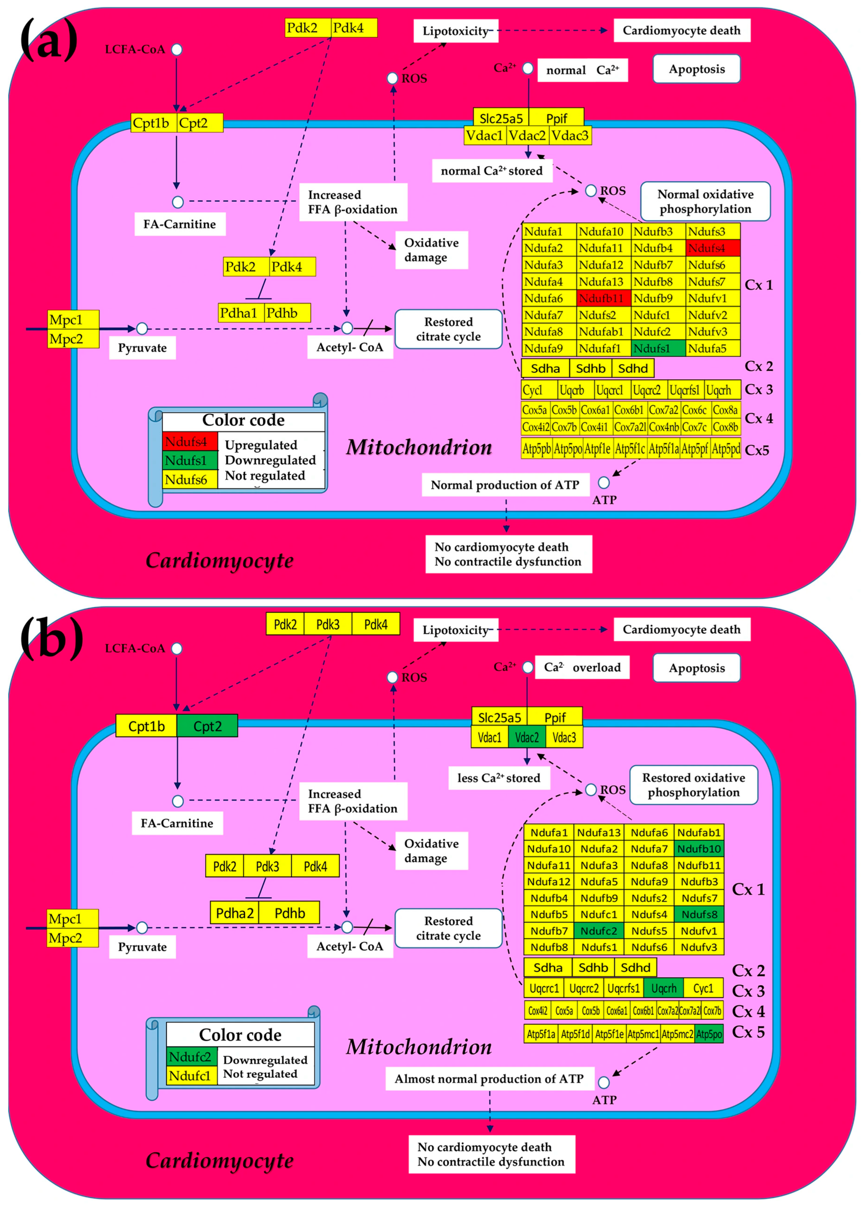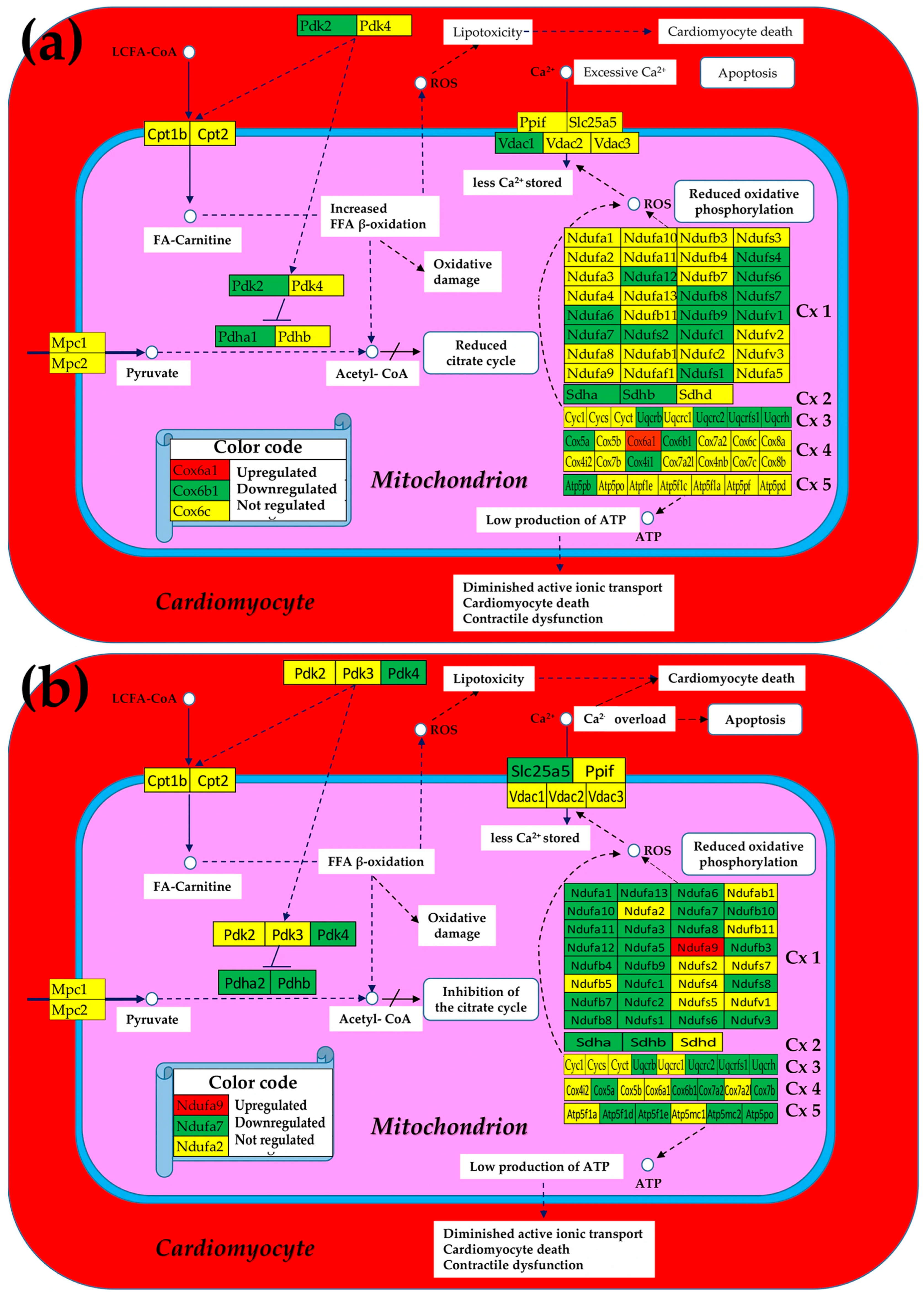 Significantly regulated mitochondrial genes in (a) Chagas disease and in (b) post-ischemic heart failure. A red/green background of the gene symbol indicates significant up/downregulation, while a yellow background indicates that the expression change was not statistically significant. Regulated genes: Atp5f1d/e (ATP synthase, H+ transporting, mitochondrial F1 complex, delta/epsilon subunit), Atp5mc2 (ATP synthase membrane subunit c locus 2), Atp5pb/o (ATP synthase peripheral Uqcrh stalk-membrane subunit b/OSCP), Cox4i1 (cytochrome c oxidase subunit IV isoform 1), Cox17 (cytochrome c oxidase, subunit XVII assembly protein homolog (yeast)), Cox5a (cytochrome c oxidase, subunit Va), Cox6a1/6b1 (cytochrome c oxidase, subunit VI a/b, polypeptide 1), Cox7a2/b (cytochrome c oxidase, subunit VIIa 2/VIIb), Cpt2 (carnitine palmitoyltransferase 2), Cyc1 (cytochrome c-1), Ndufa6/7/12 (NADH:ubiquinone oxidoreductase subunit A6/7/12), Ndufb8/9/10 (NADH: ubiquinone oxidoreductase subunit beta8/9/10), Ndufc1/2 (NADH:ubiquinone oxidoreductase subunit C1/C2), Ndufs1/4/6/7/8 (NADH dehydrogenase (ubiquinone) Fe-S protein 1/4/6/7/8), Ndufv3 (NADH:ubiquinone oxidoreductase core subunit V3), Pdha1 (pyruvate dehydrogenase E1 alpha 1), Pdk2/4 (pyruvate dehydrogenase kinase, isoenzyme 2/4), Sdha/b (succinate dehydrogenase complex, subunit A/B), Slc25a5 (solute carrier family 25 (mitochondrial carrier, adenine nucleotide translocator), member 5), Uqcrc2 (ubiquinol-cytochrome c reductase core protein 2), Uqcrfs1 (ubiquinol-cytochrome c reductase, Rieske iron–sulfur polypeptide 1), Uqcrh (ubiquinol-cytochrome c reductase hinge protein), Uqcrb/h (ubiquinol-cytochrome c reductase binding/hinge protein), and Vdac1 (voltage-dependent anion channel 1).
