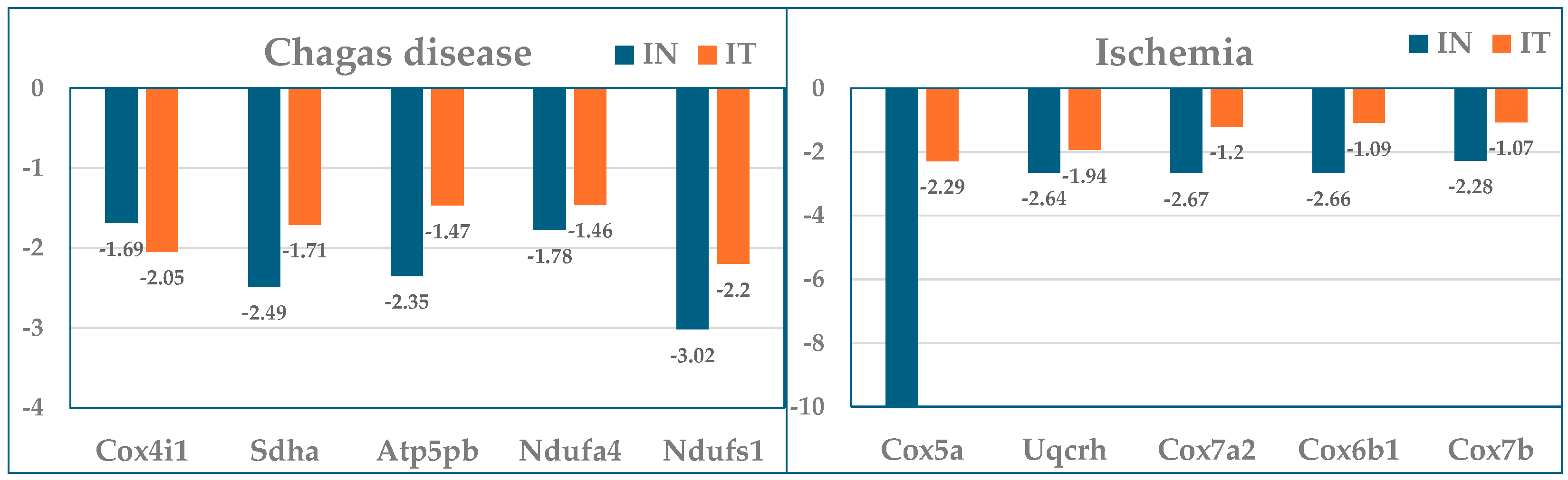 Expression ratios with respect to control (healthy mice) of the five largest mitochondrial gene contributors to the transcriptomic alterations in the treated (IT) and untreated (IN) Chagas disease and post-ischemic heart failure.