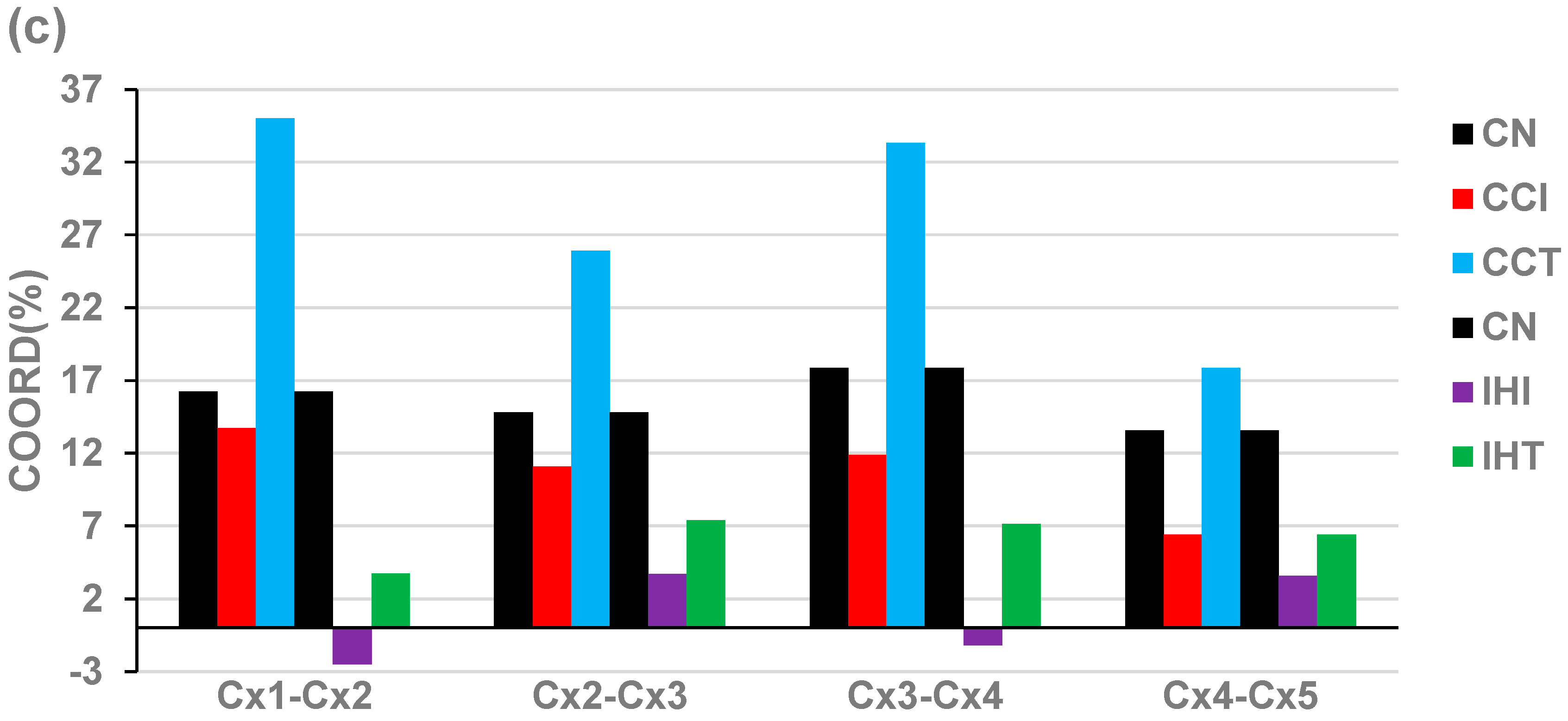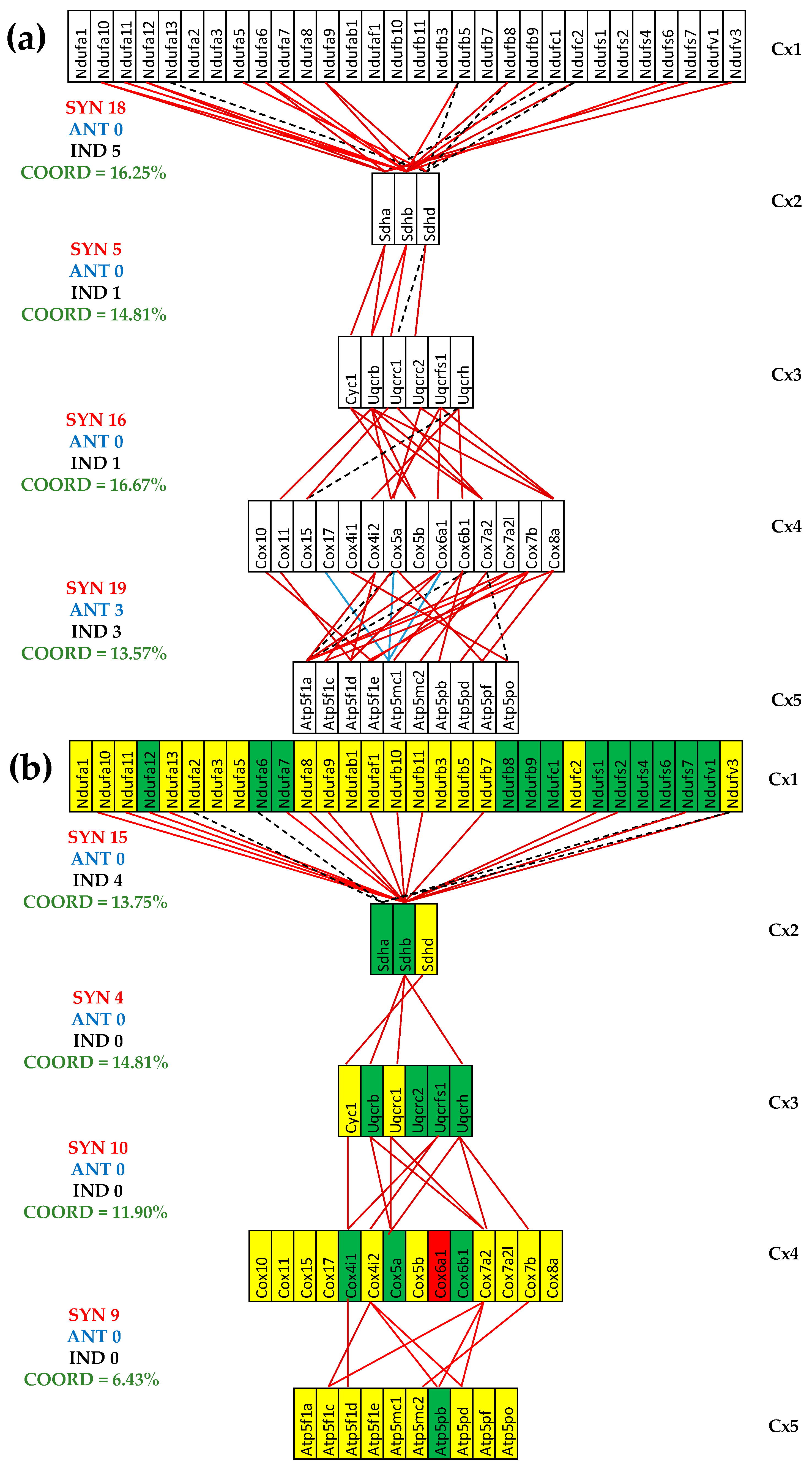 The reduction was much more considerable for the untreated IHF mice, going to even negative values (COORD(Cx1-Cx2) = −2.50%, COORD(Cx3-Cx4) = −1.19%), which means more significantly independently that synergistically + antagonistically expressed gene pairs were identified. For instance, the number of synergistically + antagonistically expressed gene pairs between complexes Cx1 and Cx2 decreased from 18 (=18 + 0) in CN to 15 (=15 + 0) in CCC and to 6 (4 + 2) in IHF, while the number of independently expressed pairs goes from five in CN to four in CCC and eight in IHF. In general, there are fewer antagonistically than independently expressed gene pairs, explaining the synchrony of the respiratory chain.