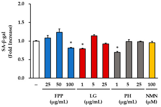 A β-galactosidase activity assay was performed to evaluate the effects of FPP, LG, PH, and NMN on cellular senescence (Figure 1). Treatment with FPP at the highest concentration (100 μg/mL) led to a statistically significant reduction in β-galactosidase activity (0.78 ± 0.02-fold relative to the control) compared to the untreated group (p < 0.05). In contrast, treatment with FPP at 25 and 50 μg/mL did not significantly change the levels of β-galactosidase activity, which were similar to or slightly higher than those of the untreated control.