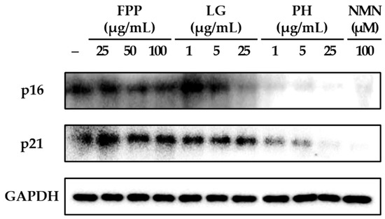 The expression levels of the cell cycle regulatory protein p16 were markedly altered following treatment with FPP, LG, PH, and NMN (Figure 2). In the FPP-treated group, p16 protein expression was reduced in a concentration-dependent manner. Although a decrease was observed at all tested concentrations (25, 50, and 100 μg/mL), statistically significant inhibitory effects were detected specifically at 50 and 100 μg/mL (p < 0.05), indicating that higher doses of FPP are required to achieve consistent suppression of p16 expression compared with the untreated control group.