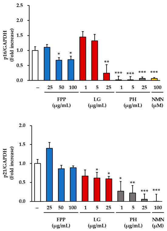 Effects of FPP, LG, PH, and NMN on p16 and p21 protein expression in HEKs. HEKs were treated with FPP (25, 50, and 100 μg/mL), LG (1, 5, and 25 μg/mL), PH (1, 5, and 25 μg/mL), or NMN (100 μM) for 24 h. The protein expression levels of p16 and p21 were determined by Western blot analysis and normalized to GAPDH. Quantitative data are presented as mean ± SEM (n = 3). Statistical significance was evaluated using one-way analysis of variance (ANOVA), followed by Tukey’s post hoc test. * p < 0.05, ** p < 0.01, and *** p < 0.001 vs. untreated control.