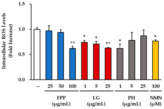Effects of FPP, LG, PH, and NMN on intracellular ROS levels in HEKs. HEKs were treated with FPP (25, 50, and 100 μg/mL), LG (1, 5, and 25 μg/mL), PH (1, 5, and 25 μg/mL), or NMN (100 μM) for 30 min. Intracellular ROS levels were measured using the DCF-DA assay and quantified by fluorescence intensity. Data are expressed as mean ± SEM (n = 3). Statistical significance was evaluated using one-way ANOVA followed by Tukey’s post hoc test. * p < 0.05, ** p < 0.01 vs. untreated control.