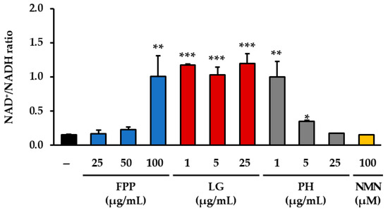Effects of FPP, LG, PH, and NMN on NAD+/NADH ratio. The NAD+/NADH ratio was determined using a commercial NAD+/NADH Assay Kit following the manufacturer’s protocol, and absorbance was measured at 450 nm using a microplate reader. Data are expressed as the mean ± SEM (n = 3). Statistical significance was assessed using one-way ANOVA with Tukey’s post hoc test. * p < 0.05, ** p < 0.01, *** p < 0.001 vs. untreated control.