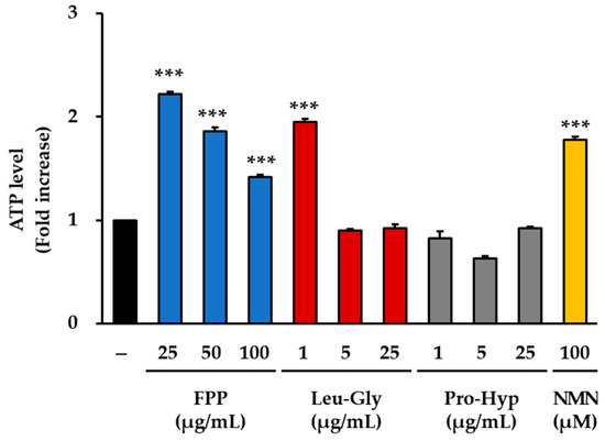 Effects of FPP, Leu-Gly, Pro-Hyp, and NMN on intracellular ATP levels in HEKs. Intracellular ATP levels were determined using a fluorometric ATP Assay Kit. HEKs were treated with FPP (25, 50, and 100 μg/mL), Leu-Gly (1, 5, and 25 μg/mL), Pro-Hyp (1, 5, and 25 μg/mL), or NMN (100 µM) for 24 h. Cell lysates were prepared and deproteinized to remove interfering enzymes before analysis. Data are expressed as the mean ± SEM (n = 2). Statistical significance was assessed using one-way ANOVA followed by Tukey’s post hoc test. *** p < 0.001 vs. untreated control.