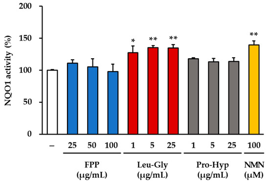 Effects of FPP, LG, PH, and NMN on NQO1 activity in HEKs. HEKs were treated with FPP (25, 50, and 100 μg/mL), LG (1, 5, and 25 μg/mL), PH (1, 5, and 25 μg/mL), or NMN (100 μM) for 24 h. NQO1 activity was assessed using an NQO1 Activity Assay Kit and expressed as a percentage relative to that of the untreated control group. Data are shown as mean ± SEM (n = 3). Statistical significance was evaluated using one-way ANOVA followed by Tukey’s post hoc test. * p < 0.05, ** p < 0.01 vs. control.