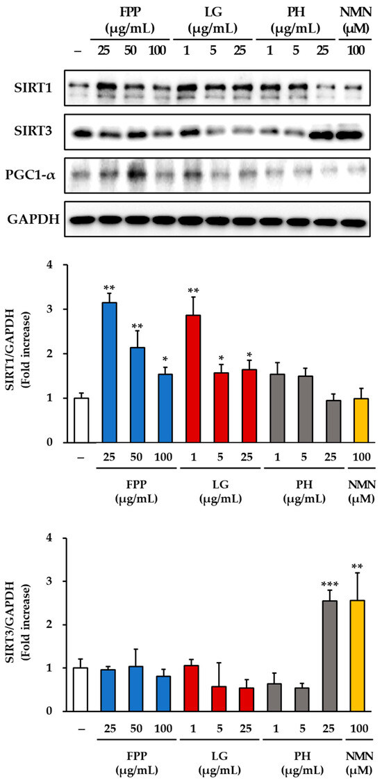 Effects of FPP, LG, PH, and NMN on SIRT1, SIRT3, and PGC-1α protein expression in HEKs. HEKs were treated with FPP (25, 50, and 100 μg/mL), LG (1, 5, and 25 μg/mL), PH (1, 5, and 25 μg/mL), or NMN (100 μM) for 24 h. The protein expression levels of SIRT1, SIRT3, and PGC-1α were determined by Western blotting and normalized to GAPDH. Data are presented as mean ± SEM (n = 3). Statistical significance was assessed using one-way ANOVA with Tukey’s post hoc test. * p < 0.05, ** p < 0.01, *** p < 0.001 vs. untreated control.