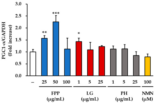 PGC-1α expression was notably upregulated by FPP treatment compared to that in the control group. The greatest increase was observed at 50 μg/mL (p < 0.001), followed by a significant increase at 25 μg/mL (p < 0.01). LG treatment produced a modest but significant increase in PGC-1α protein expression at 1 μg/mL (p < 0.05), whereas no significant changes were detected at higher concentrations (5 and 25 μg/mL). The PH and NMN treatment groups did not show any significant alterations in PGC1α expression compared to that in the control group.