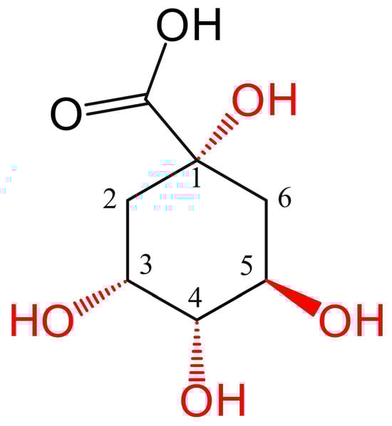 Chemical structures of quinic acid and four R-base derivatives. The stereochemistry of the natural (3R,5R)-configured quinic acid scaffold is crucial for activity and is retained in all derivatives, as highlighted by the wedged and dashed bonds. The numbers indicate the positional numbering of the substituents on the quinic acid ring, and the red color highlights potential substitution sites.