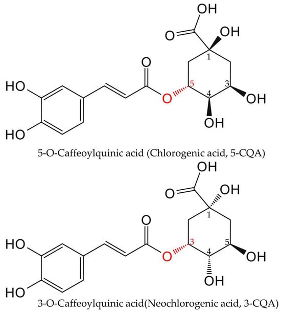 A critical nomenclature clarification is essential, particularly regarding the distinct isomers 3-CQA and 5-CQA. To clarify these critical distinctions, we provide a direct comparison in Figure 2. Historically, “chlorogenic acid” referred to 3-CQA, but the 1976 IUPAC revision reassigned it to 5-CQA. This outdated usage persists in some literature and supplier catalogs, causing ongoing confusion. To ensure clarity throughout this review, we will exclusively use the systematic name 5-O-Caffeoylquinic acid (5-CQA), which corresponds to CAS number 327-97-9.