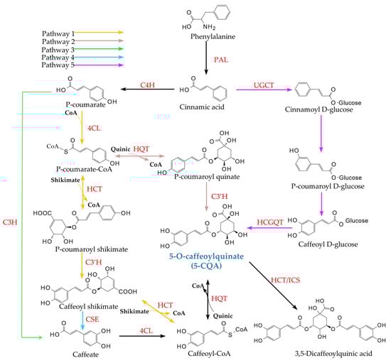 Plants biosynthesize CQAs primarily via the phenylpropanoid pathway, which first yields 5-CQA [9]. This central compound then serves as a precursor for its isomers, such as 3-CQA and 4-CQA, as well as for more complex poly-caffeoylquinic acids. Furthermore, 5-CQA occupies a branch point in the pathway leading to lignin monomer synthesis, a connection that has been extensively documented [18]. Given this central role, the following section reviews five reported biosynthetic routes for 5-CQA. Gene expression within these pathways varies significantly across plant species. Notably, in many species, only one or two of these routes function as the predominant biosynthetic pathways for 5-CQA, while some are unique to particular plant lineages [19,20,21]. 5-CQA synthesis initiates when phenylalanine undergoes deamination by Phenylalanine ammonia-lyase (PAL) to form trans-cinnamic acid [18]. The five distinct biosynthetic routes characterized for 5-CQA are shown in Figure 3, with Pathways 1 and 2 being the most prevalent in plants, having been confirmed in widely studied families such as Asteraceae, Solanaceae, and Rubiaceae [21]. In contrast, Pathways 3 and 4 represent specialized branches derived from enzymes unique to certain plant species. Notably, Pathway 5 operates independently of the others and has thus far been reported exclusively in sweet potato (I. batatas) [9,22,23].