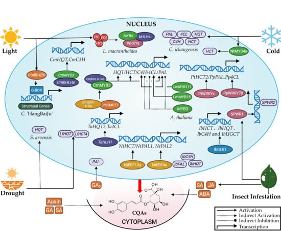 The WRKY transcription factor family mediates plant responses to drought, cold, heat, and salinity stresses while regulating signaling networks and structural genes in CQAs biosynthesis [61,62]. Transient overexpression of PtWRKY60, PtWRKY89, PtWRKY93, PtWRKY38, and PtWRKY45 in poplar (P.tomentosa) significantly increased expression levels of PtHCT2, correspondingly elevating 5-CQA accumulation [63]. Wang et al. cloned NtWRKY41a from tobacco, demonstrating that its overexpression enhances CGA and anthocyanin biosynthesis while suppressing scopolin and flavonoid production. Mechanistically, NtWRKY41a activates NtCCoAOMT and NtHST promoters while repressing NtF6’H1 and NtGT3 transcription [64] (Figure 3). In peach (Prunus persica (L.) Batsch), PpWRKY70 binds and activates PpPAL and Pp4CL promoters. Under methyl jasmonate or pathogen induction, this increases total phenolics, flavonoids, and CGA accumulation in fruit [65].