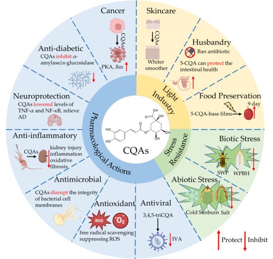 The bioactivity profile of CQAs underpins their potential across diverse sectors. Pharmacologically, CQAs exhibit anti-inflammatory, antioxidant, neuroprotective, anticancer, antimicrobial, antiviral, and antidiabetic properties, often mediated through key pathways such as NF-κB, TLR, and Nrf2. In light industry, CQAs serve as antibiotic alternatives in animal feed, natural preservatives in food packaging, and active ingredients in skincare formulations due to their antioxidant and UV-protective properties. Moreover, CQAs contribute to plant resilience against cold, drought, salinity, and insect herbivory, primarily through ROS scavenging and direct antimicrobial or antifeedant actions.
