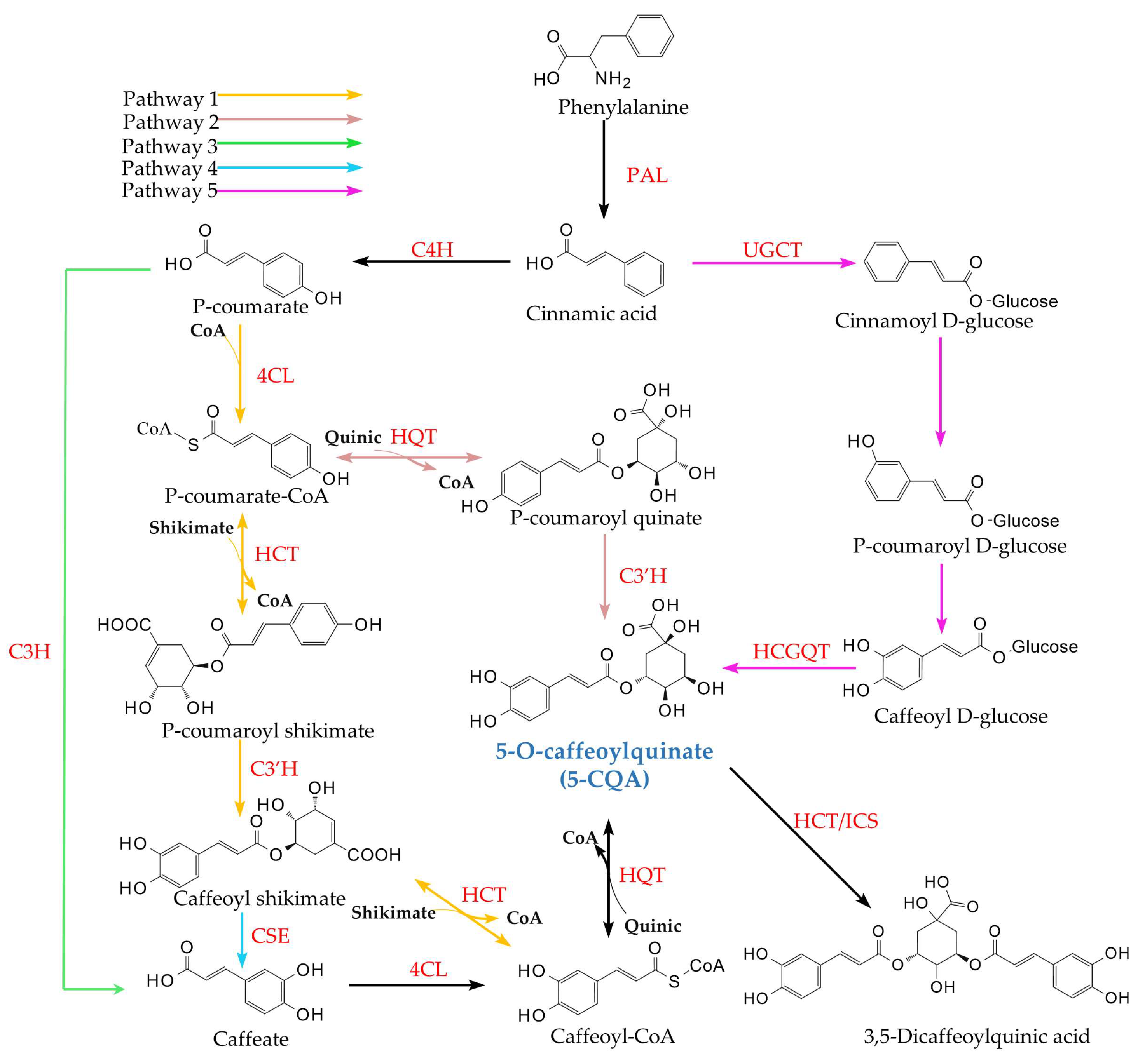 - Cheevarungnapakul, K.; Khaksar, G.; Panpetch, P.; Boonjing, P.; Sirikantaramas, S. Identification and Functional Characterization of Genes Involved in the Biosynthesis of Caffeoylquinic Acids in Sunflower (Helianthus annuus L.). Front. Plant Sci. 2019, 10, 968. [Google Scholar] [CrossRef]