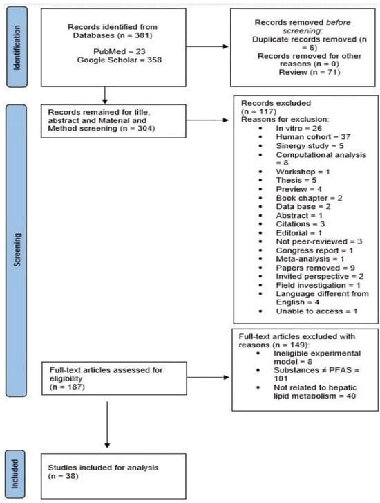 In extent, all the articles published between the years 2021 and 2024, containing simultaneously one word from the first and second bracket and the exact phrase “hepatic lipid metabolism” were considered for inclusion. Out of the 381 articles initially identified in the years of reference, only 38 were eligible to be included and analyzed in the present scoping review. The selection process was performed by examining the title, abstract and the Materials and Methods Section to assess the conformity of the studies with the purpose of our work. Mandatory criteria for the article to be included were the usage of the English language and the employment of experimental animal models to evaluate the impact of PFAS specifically on the hepatic lipid metabolism through biochemical, molecular, histological and omics techniques. All the articles included had to be related to the mechanisms of PFAS concerning the liver, its functions, steatosis, the alteration of biomarkers of oxidative stress and inflammation, and the qualitative and quantitative alterations of lipids, metabolites, proteins, and gene expression of well-established biomarkers of liver function.
