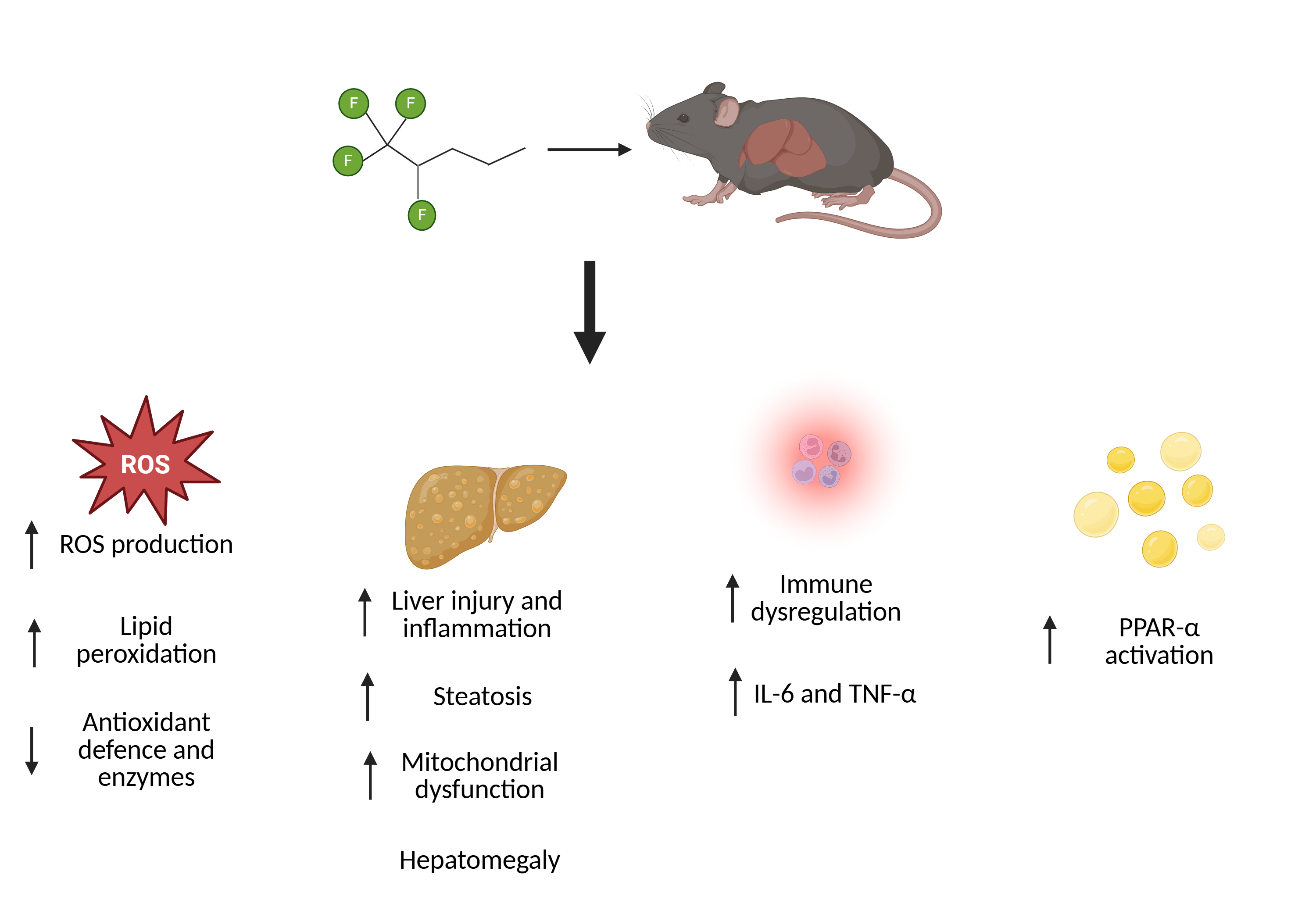 | Liver histopathology | In the PFHxS-exposed group: hepatocytes showed more distinct characteristics of degeneration, more consistent lipid deposition and steatosis. | |||||