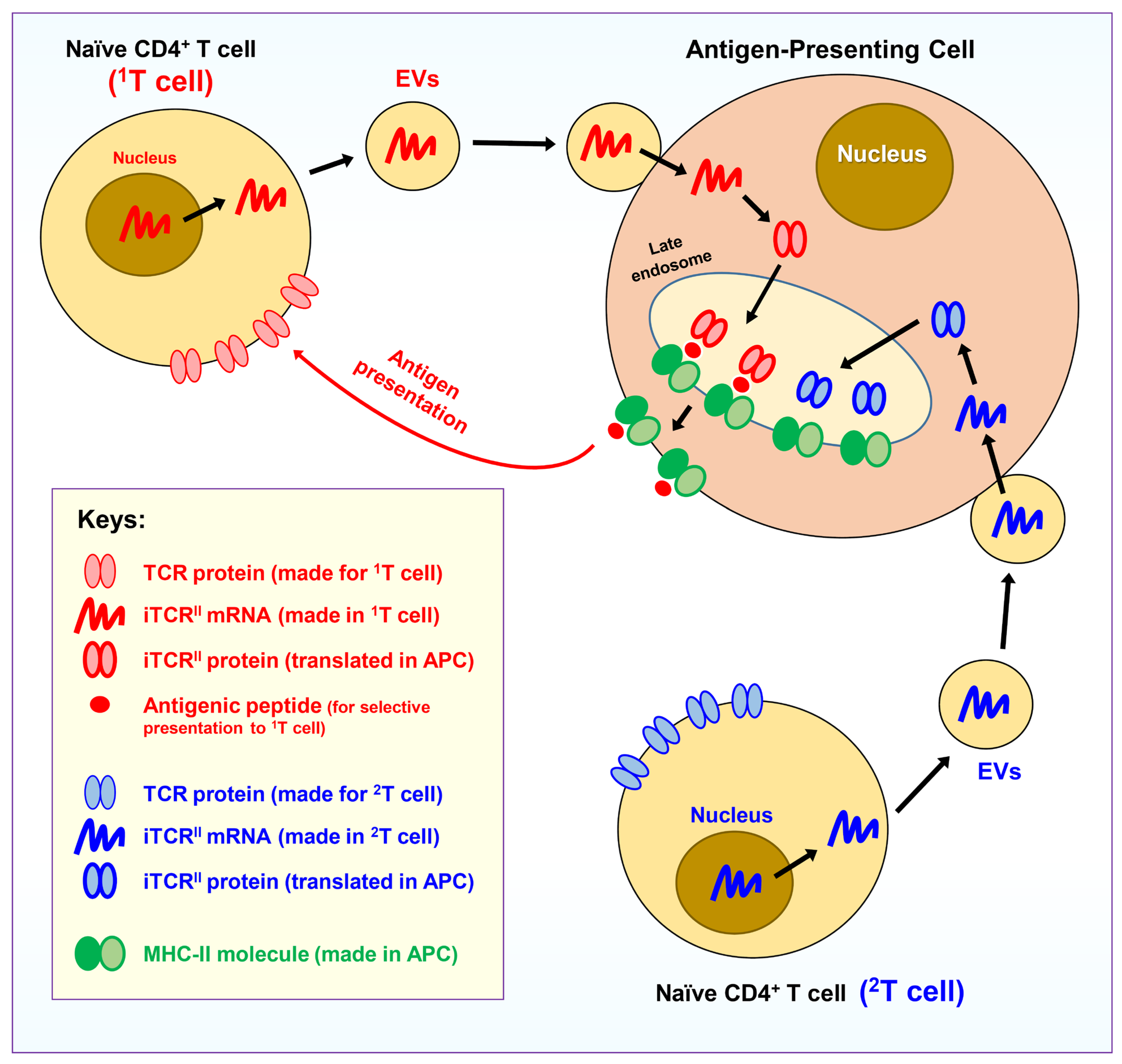 II proteins which help select non-self-peptides for presentation by the MHC-II molecules. It is speculated that a naïve APC may receive EVs (which contain iTCR