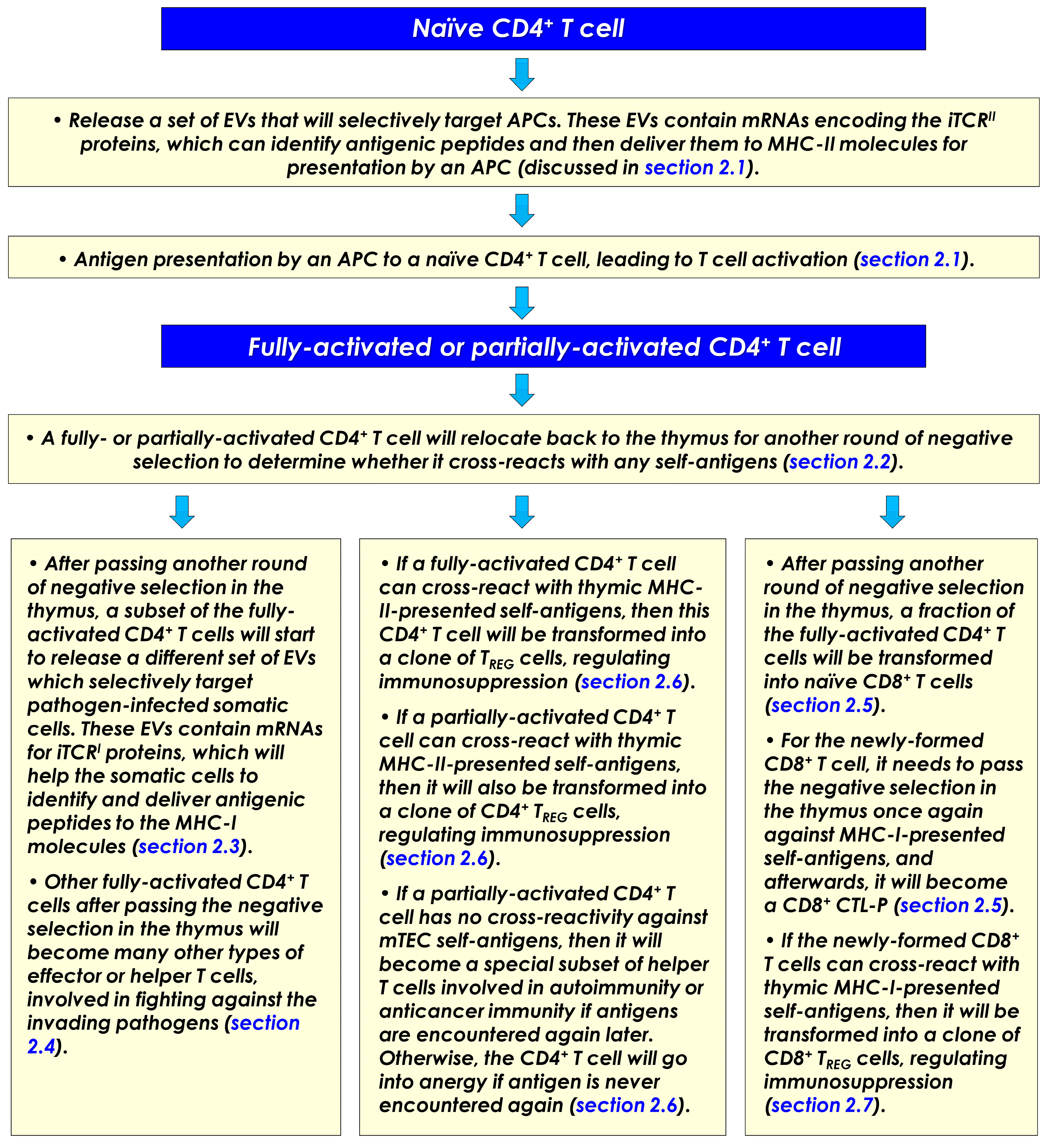 Following the full activation of a naïve CD4+ T cell by an APC, it is hypothesized that this T cell will return to the thymus for another round of negative selection to make certain that it does not cross-react with mTEC-presented self-peptides. After the T cell has successfully passed the negative selection, it is licensed to undergo proliferation inside the thymus and in peripheral secondary lymph tissues to become a clone of CD4+ effector/helper T cells. It is hypothesized that a subset of the CD4+ effector/helper T cells will release EVs which contain mRNAs encoding the iTCRI proteins, and these EVs are specially designed for uptake by pathogen-infected somatic cells in the body. These iTCRI proteins will work jointly with the MHC-I molecules to selectively present pathogen-derived antigenic peptides in infected somatic cells.