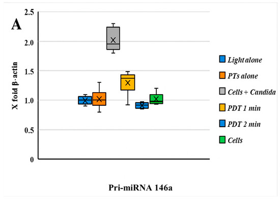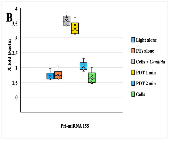 (A) The graph reported the values of the expression of Pri-miRNA 146a before and after PDT; comments are summarized below. (B) Boxplot graphs regarding the miRNA 155 expression patterns of HEK-293 cells infected with an MDR strain of C. albicans with/without PDT treatment and different combinations. A significant statistical difference between HEK-293 cells infected with C. albicans was observed only with PDT treatment after 2 min of light exposition (p < 0.05). A decrease in the pri-miRNA 146a and pri-miRNA 155 expression levels (compared with β-actin = 1) was observed during PDT with a light wavelength of 470 nm for 1 min.