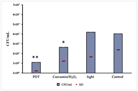 Evaluation of antimicrobial activity of the PDT on C. albicans cells inoculated in HEK-293 line cells. From the left to the right: CFU in the PDT group; CFUs in the group only treated with PS; CFUs only exposed to light; and CFUs of negative control (no treatment). The standard deviation values are represented by a red line; 3 technical triplicates were obtained from 3 biological triplicates; and a weighted average on different dilutions was used. Only the control in comparison with the PDT treatment showed a significant difference (** p < 0.05); the other combinations were not significant (* p > 0.05), using the ANOVA statistical approach.
