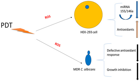 Our findings suggest that PDT exerts a dual action—targeting both fungal cells and host cells. The rapid burst of ROS generated by PDT may trigger the antioxidant defense mechanisms of HEK-293 cells, leading to the downregulation of the pri-miRNAs involved in inflammation. Conversely, C. albicans cells, lacking an efficient antioxidant system, are more susceptible to oxidative damage, resulting in growth inhibition [49,50,51].