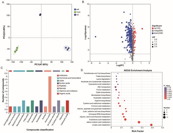 Metabolomic profiling of ST post-germination stages in response to exogenous salt stress. (A) Principal component analysis (PCA) of metabolites in control- and salt-treated samples. (B) Volcano plot of differentially expressed metabolites (DEMs). (C) Classification of DEMs by KEGG category. (D) KEGG pathway enrichment analysis of DEMs.