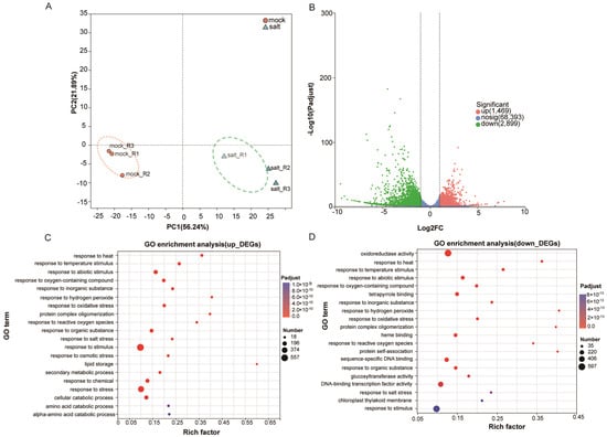 Transcriptomic profiling of ST in the post-germination stage under exogenous salt stress. (A) PCA of transcriptomic profiles of the control and salt-treated samples. (B) Volcano plot showing differentially expressed genes (DEGs) between control and salt-treated seedlings; red and blue dots represent significantly up- and downregulated genes, respectively. (C,D) Gene Ontology–Biological Process (GO-BP) enrichment analysis of (C) upregulated and (D) downregulated DEGs; top enriched terms shown (FDR < 0.05).