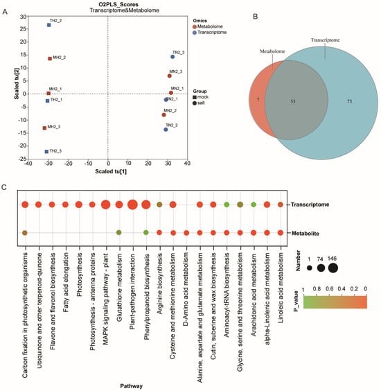 Correlation between the metabolomic and transcriptomic responses to salt stress. (A) O2PLS score plot showing joint variation between metabolomic and transcriptomic datasets; T-values represent transcriptomic scores, and U-values represent metabolomic scores. (B) Venn diagram of KEGG pathways enriched in DEGs and DEMs. (C) Top 20 KEGG pathways containing the highest number of DEGs and DEMs identified by integrated omics analysis.