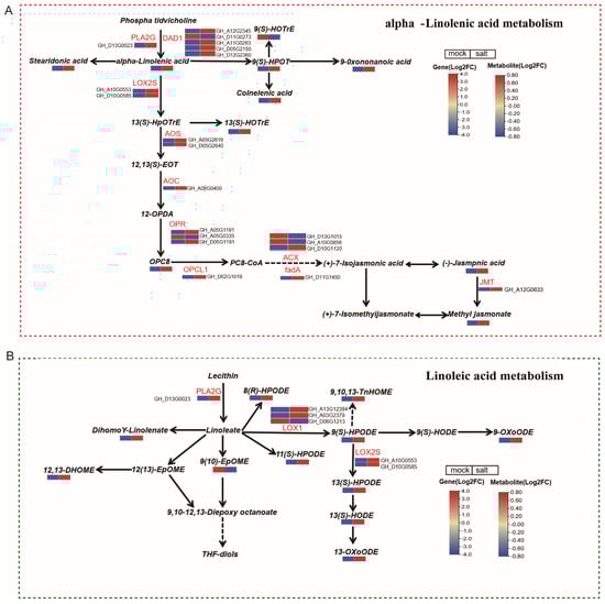 DEGs and DEMs involved in (A) alpha-linolenic acid metabolism and (B) linoleic acid metabolism in early-stage cotton seedlings under salt stress. Each rectangular block is split in half, representing expression under salt (left) and control (right) conditions for DEGs and differentially accumulated metabolites (DAMs).