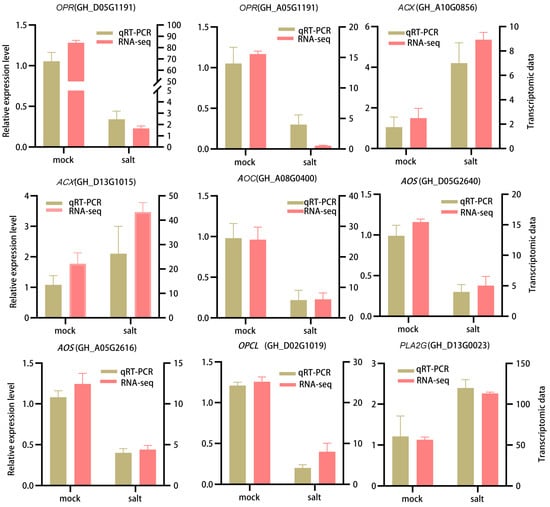 To validate the reliability of the transcriptomic data, qRT-PCR was performed on eight representative DEGs involved in alpha-linolenic acid, including OPR, ACX, AOC, AOS, and OPC. As shown in Figure 6, the expression patterns observed by qRT-PCR were consistent with the transcriptomic data, demonstrating similar trends of upregulation under salt stress. This concordance confirms the robustness and reproducibility of the RNA-seq results.