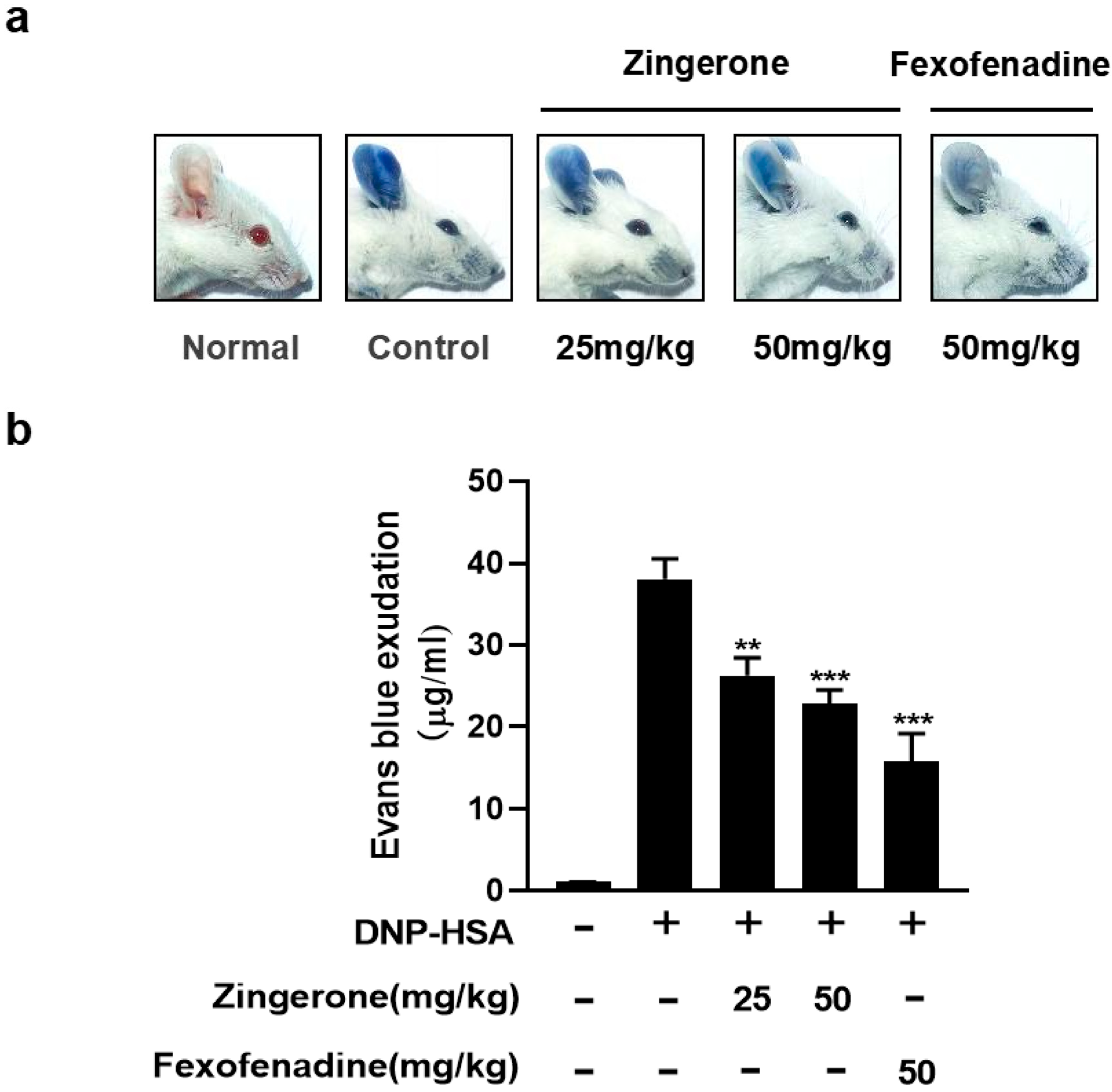 3.5. Zingerone Suppresses IgE-Mediated Passive Cutaneous Anaphylaxis (PCA) in Mice