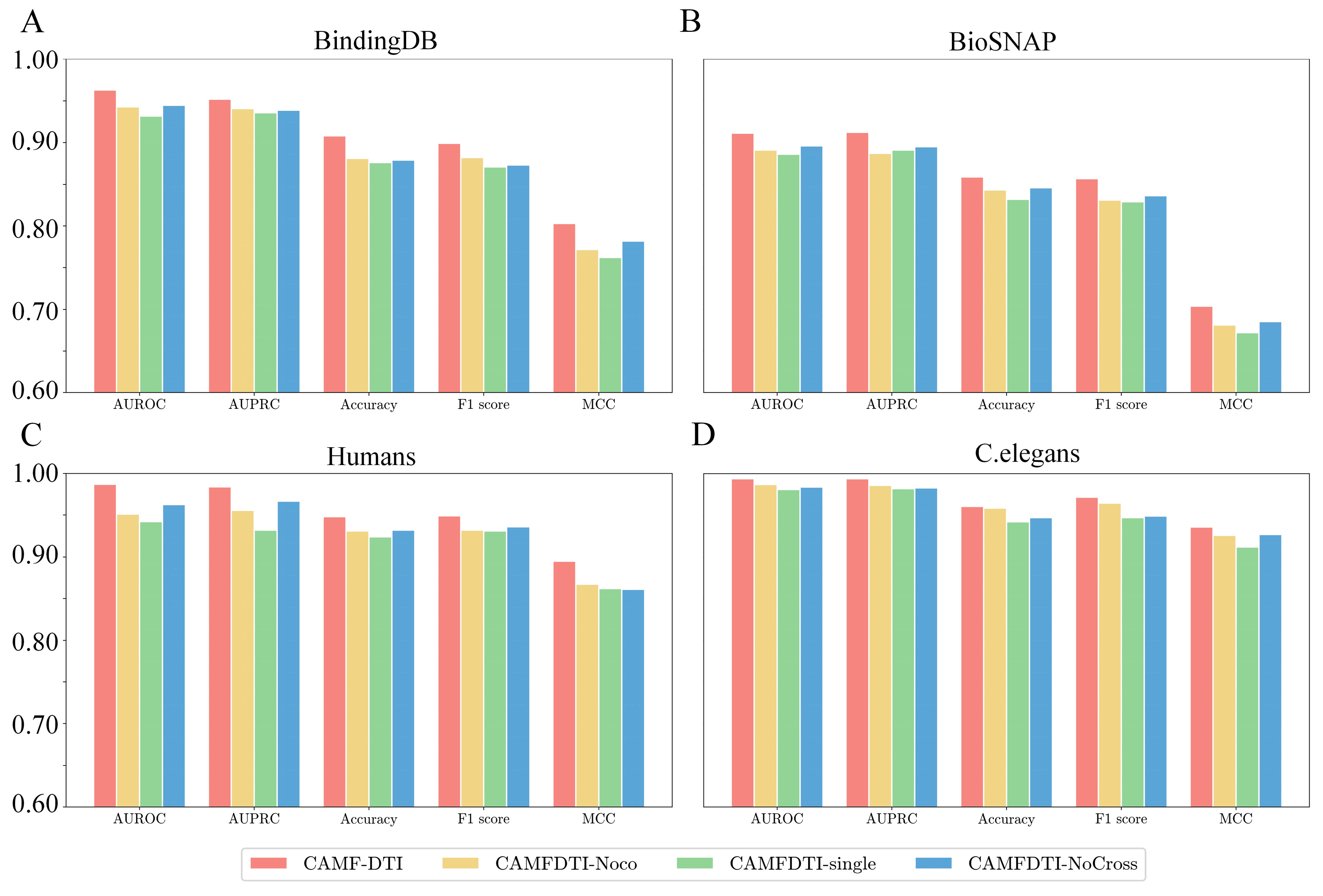 - Experimental results on multiple benchmark datasets demonstrate that CAMF-DTI outperforms existing state-of-the-art methods across AUROC, AUPRC, Accuracy, F1 score, and MCC metrics, indicating superior predictive performance and strong generalization ability.