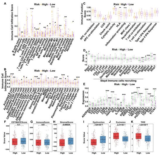 Differences in immune infiltration and function across risk groups in TCGA-LIHC. (A) Differential immune cell infiltration in different risk groups (CIBERSORT). (B) Differential immune cell infiltration in different risk groups (GSVA). (C) Differential immune function in different risk groups. (D) Differential analysis of high and low risk groups with respect to the seven steps of the cancer immune cycle. The status of anticancer immunity across seven-step Cancer-Immunity Cycle including release of cancer cell antigens (Step 1), cancer antigen presentation (Step 2), priming and activation (Step 3), trafficking of immune cells to tumors (Step 4), infiltration of immune cells into tumors (Step 5), recognition of cancer cells by T cells (Step 6) and killing of cancer cells (Step 7). (E) Differential expression of immunoinhibitors among different risk groups. (F–H) Relationship between different risk groups and estimate score (F), stromal score (G), and immune scores (H). (I–K) Relationship between different risk groups and TIDE score. (I) T-cell dysfunction score. (J) T-cell exclusion score. (K) TIDE score. (* p < 0.05, ** p < 0.01, *** p < 0.001).