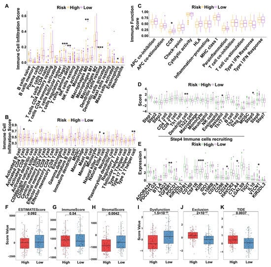 Differences in immune infiltration and function across risk groups in HCCDB18. (A) Differential immune cell infiltration in different risk groups (CIBERSORT). (B) Differential immune cell infiltration in different risk groups (GSVA). (C) Differential immune function in different risk groups. (D) Differential analysis of high and low risk groups with respect to the seven steps of the cancer immune cycle. The status of anticancer immunity across seven-step Cancer-Immunity Cycle including release of cancer cell antigens (Step 1), cancer antigen presentation (Step 2), priming and activation (Step 3), trafficking of immune cells to tumors (Step 4), infiltration of immune cells into tumors (Step 5), recognition of cancer cells by T cells (Step 6) and killing of cancer cells (Step 7). (E) Differential expression of immunoinhibitors among different risk groups. (F–H) Relationship between different risk groups and estimate score (F), stromal score (G), and immune scores (H). (I–K) Relationship between different risk groups and TIDE score. (I) T-cell dysfunction score. (J) T-cell exclusion score. (K) TIDE score. (* p < 0.05, ** p < 0.01, *** p < 0.001).