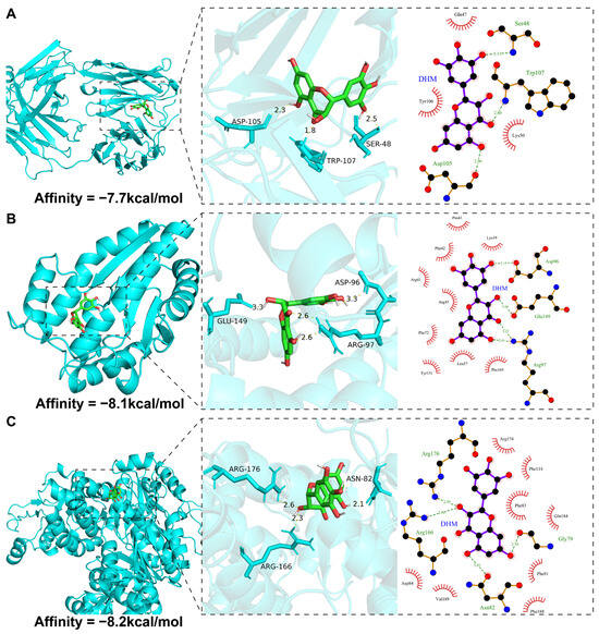 Molecular docking results of DHM with 3 DHMGs. (A) MAPT, (B) DTYMK, (C) UCK2.