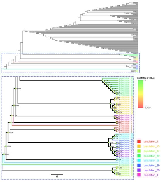 Phylogenetic tree of the studied isolates. Color coding corresponds to different populations. Branch lengths represent the genetic distance between samples. The enlarged fragment shows the details of population clustering, including the bootstrap values.