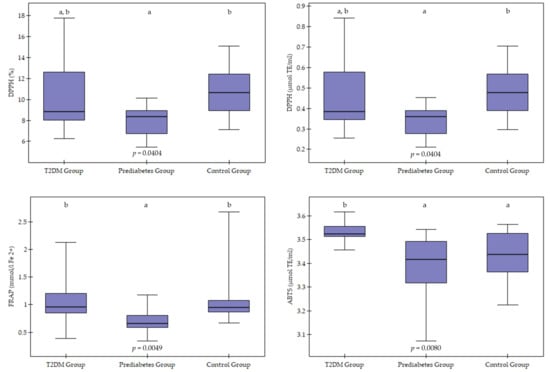 Graphic visualisation of antioxidant activity using the DPPH (2,2-diphenyl-1-picrylhydrazyl radical), ABTS (2,2′-azino-bis(3-ethylbenzothiazoline-6-sulfonic acid)) and FRAP (Ferric Reducing Antioxidant Power) methods in the study groups. T2DM—Type 2 Diabetes. Values are presented as median and interquartile range. Group differences were visualised using boxplots showing the median (horizontal line) and interquartile range (box), with whiskers representing 1.5× IQR. Differences between groups were assessed using the Kruskal–Wallis test with Dunn’s post hoc analysis (Bonferroni correction). Groups marked with different letters differ statistically significantly (e.g., a, b) (p < 0.05), whereas groups marked with the same letter do not differ statistically (egg, a, a or b, b) (p > 0.05).