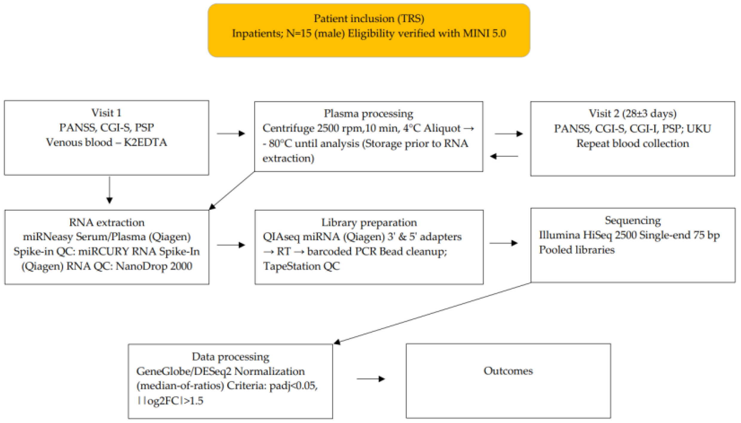 - Kotas, M.; Stańczykiewicz, B.; Sporniak, B.; Pawlak, E.; Misiak, B. A systematic review of miRNA expression in schizophrenia spectrum disorders across the blood and the brain. Neurosci. Biobehav. Rev. 2025, 176, 106292. [Google Scholar] [CrossRef] [PubMed]
