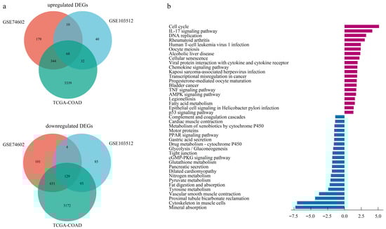 Identification and functional enrichment of differentially expressed genes (DEGs). (a) Venn diagram illustrating the intersection of up-regulated and down-regulated DEGs identified from two GEO datasets and one TCGA dataset. (b) Barplot of KEGG pathway enrichment analysis for the consensus DEGs.