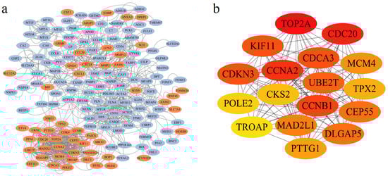 A PPI network was built using STRING, comprising 159 gene nodes and 1036 edges. DEGs were visually represented, with 53 upregulated and 106 downregulated genes being color-coded in red and blue, respectively (Figure 2a). Subsequent analysis via Cytoscape cytoHubba identified 17 hub genes among the 159 nodes: TROAP, CDKN3, CDCA3, UBE2T, CEP55, KIF11, CDC20, CCNA2, MCM4, CKS2, POLE2, MAD2L1, CCNB1, PTTG1, TPX2, TOP2A, and DLGAP5 (Figure 2b). Notably, all hub genes were upregulated and highlighted in yellow (Figure S3).