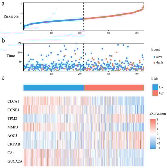 A total of 16, and 21 survival related genes were identified by the Kaplan–Meier survival analysis (Tables S2 and S4, Logrank test, p-value < 0.05), and the univariate Cox analysis (Tables S3 and S5, p-value < 0.05), respectively. The intersection of genes selected by both methods yielded 8 survival-associated genes: CLCA1, CCNB1, TPM2, MMP3, AOC3, CRYAB, CA4, and GUCA2A. The Kaplan–Meier curves for those 8 genes were shown in Figure S5. Using these 8 genes and overall survival data, we developed a multivariate Cox proportional hazards model to calculate prognostic risk scores. Risk quantification was performed using the equation: Risk Score = (−0.0537 × Expression CLCA1) + (−0.2222 × Expression CCNB1) + (0.0936 × Expression TPM2) + (0.1112 × Expression MMP3) + (0.0025 × Expression AOC3) + (0.0591 × Expression CRYAB) + (−0.0011 Expression CA4) + (−0.0411 × Expression GUCA2A).