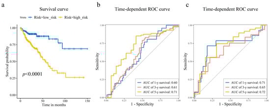 As shown in Figure 3a,b, CRC patients with higher risk scores exhibited increased mortality rates. Figure 3c displays the expression heatmap of 8 prognostic genes across groups stratified. Kaplan–Meier analysis demonstrated a pronounced disparity in survival, with the high-risk cohort exhibiting a significantly diminished probability of survival compared to low-risk cohort (Figure 4a). Time-dependent ROC curves validated the prognostic signature, with AUC values of 0.60 (1-year), 0.61 (3-year), and 0.71 (5-year) in the training set (Figure 4b), and 0.71 (1-year), 0.65 (3-year), and 0.72 (5-year) in the test set (Figure 4c).