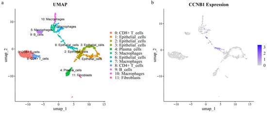 UMAP visualization of a CRC single-cell RNA dataset. (a) Cellular clusters identified within the dataset. (b) Expression levels of the CCNB1 gene across the identified clusters.