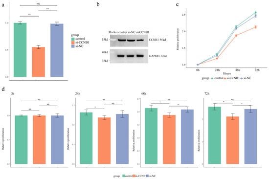 Functional Validation of CCNB1 in SW480 Cells. (a) Quantitative real-time PCR (qRT-PCR) analysis of CCNB1 mRNA expression levels across three experimental groups. (b) Western blot analysis of CCNB1 protein expression levels in the three groups. (c) Assessment of cell proliferative capacity over time via CCK-8 assay, presented as a growth curve. (d) Column graph comparing the proliferative capacity of SW480 cells across the three groups at specific time points (0, 24, 48, and 72 h). The results are expressed as mean ± SD. ** p < 0.01, *** p < 0.001, NS p > 0.05.