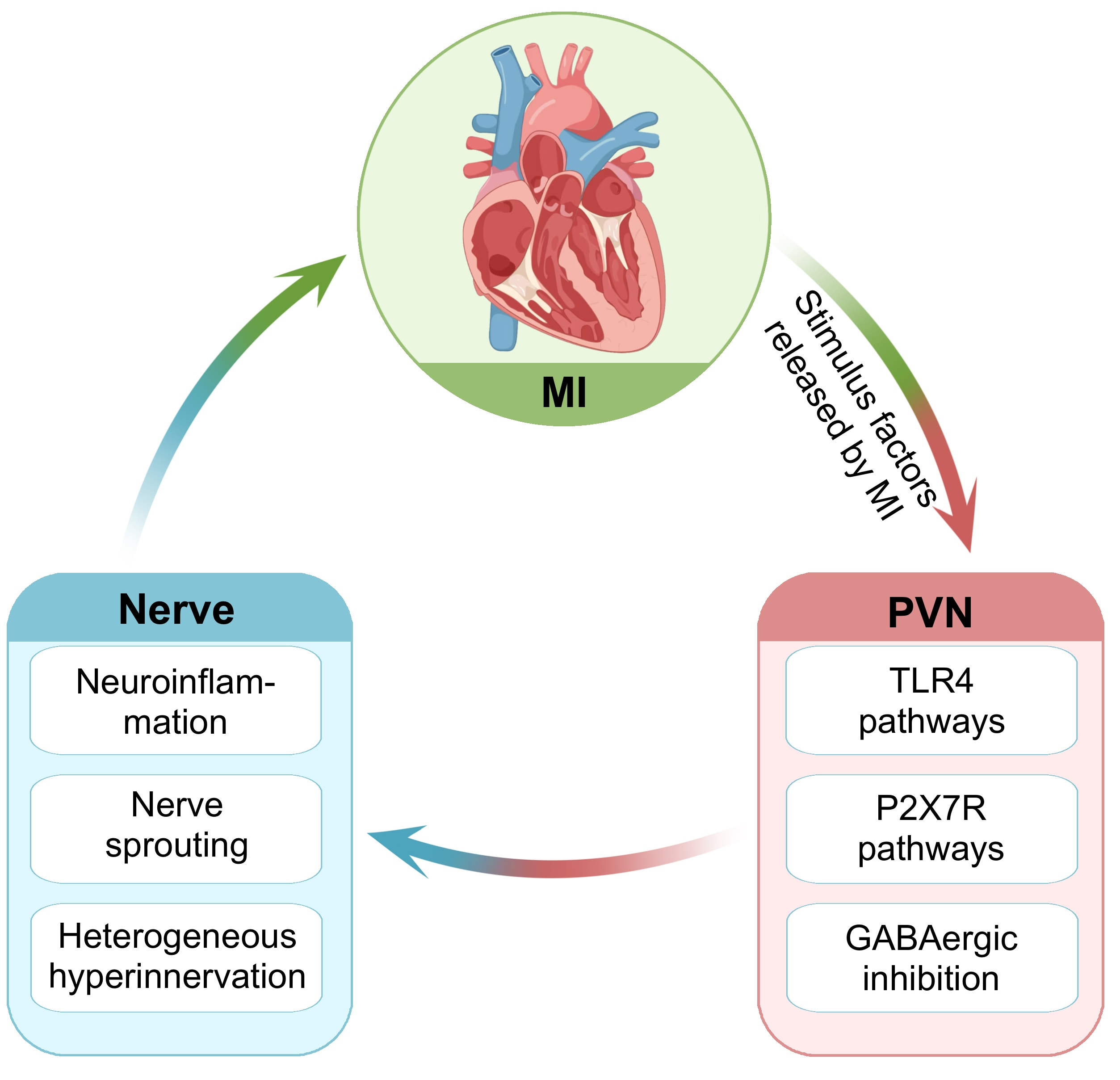 Sympathetic remodeling following MI involves coordinated changes across the brain–heart axis. Three PVN signaling pathways—TLR4/MyD88/NF-κB, P2X7R/NLRP3, and GABAergic disinhibition—initiate and amplify central sympathetic dysregulation. Peripheral stellate ganglion remodeling (P2Y1R/IGFBP2, ECM changes) further amplifies these signals, producing heterogeneous cardiac hyperinnervation that creates arrhythmogenic substrates. Causal links between molecular pathways and arrhythmias are established through interventional studies showing that pathway modulation reduces both neuroinflammation and arrhythmia burden. Emerging biomarkers and neuromodulation strategies offer pathways toward mechanism-based prevention, but rigorous clinical validation is essential to translate preclinical discoveries into improved patient outcomes.