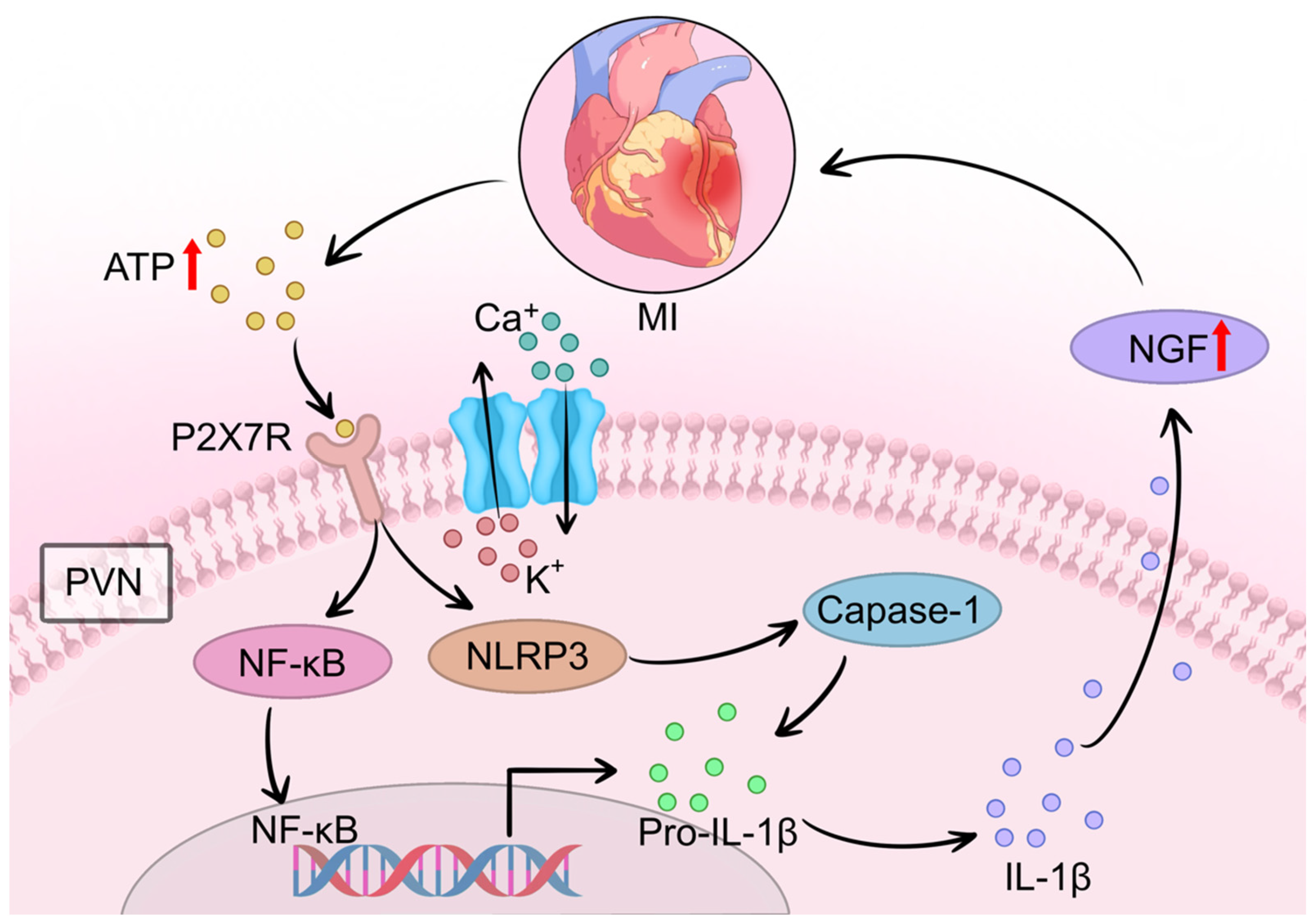 | P2X7R/NLRP3 | Rat MI (LAD ligation) | ATP → P2X7R activation → NLRP3 inflammasome → IL-1β release → NGF upregulation | P2X7R blockade reduces PVCs and VT; decreases nerve sprouting |